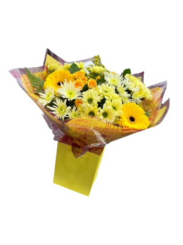 Say your simply the best mum by sending her this hand-tied bouquet of fresh yellow and cream flowers.